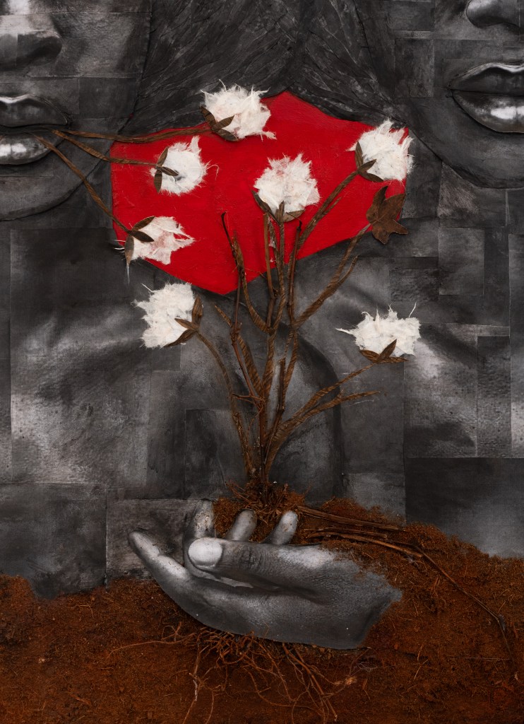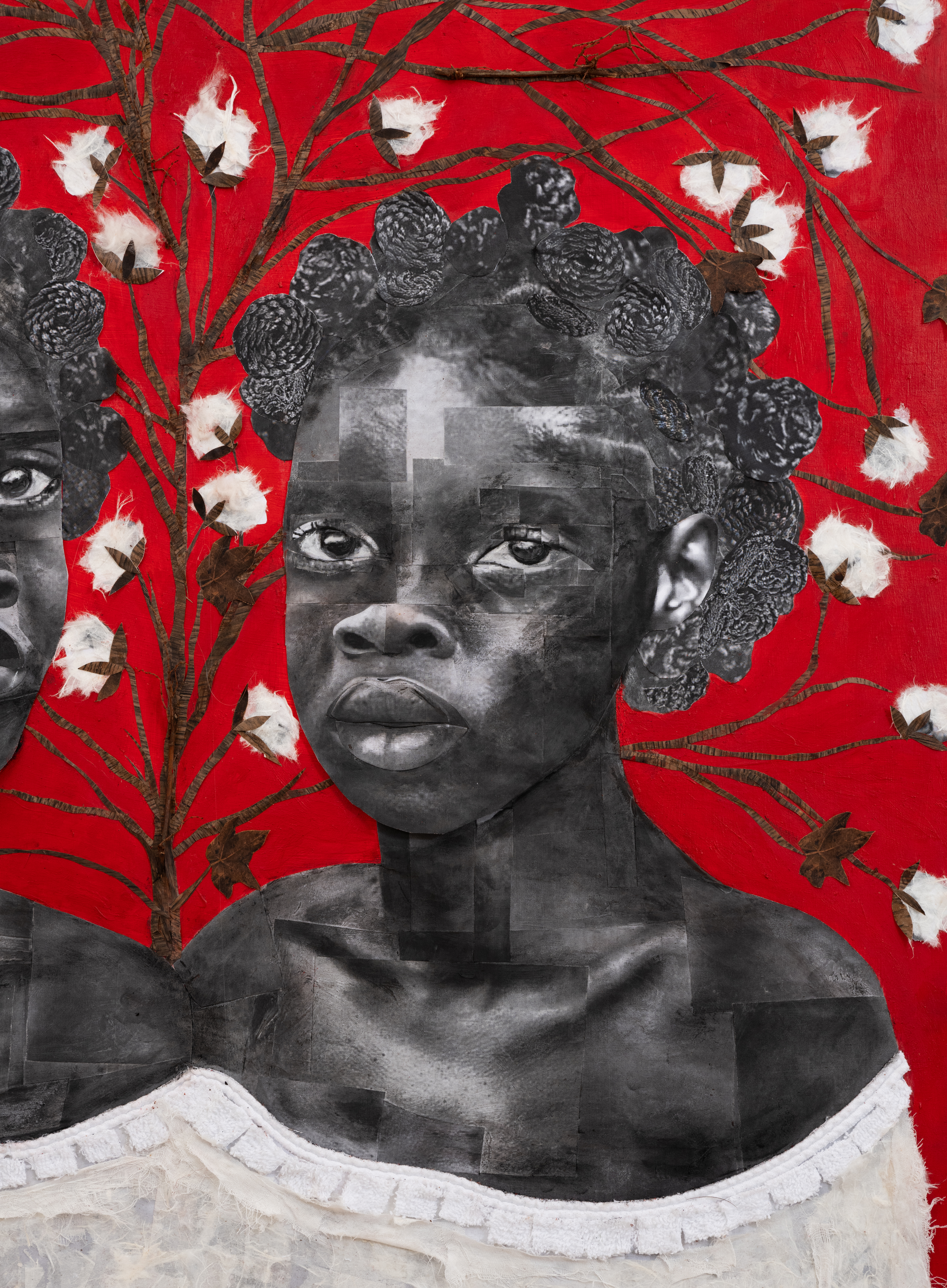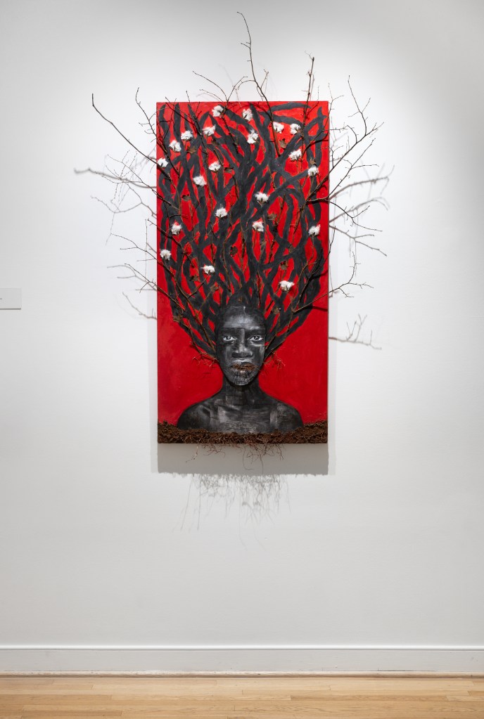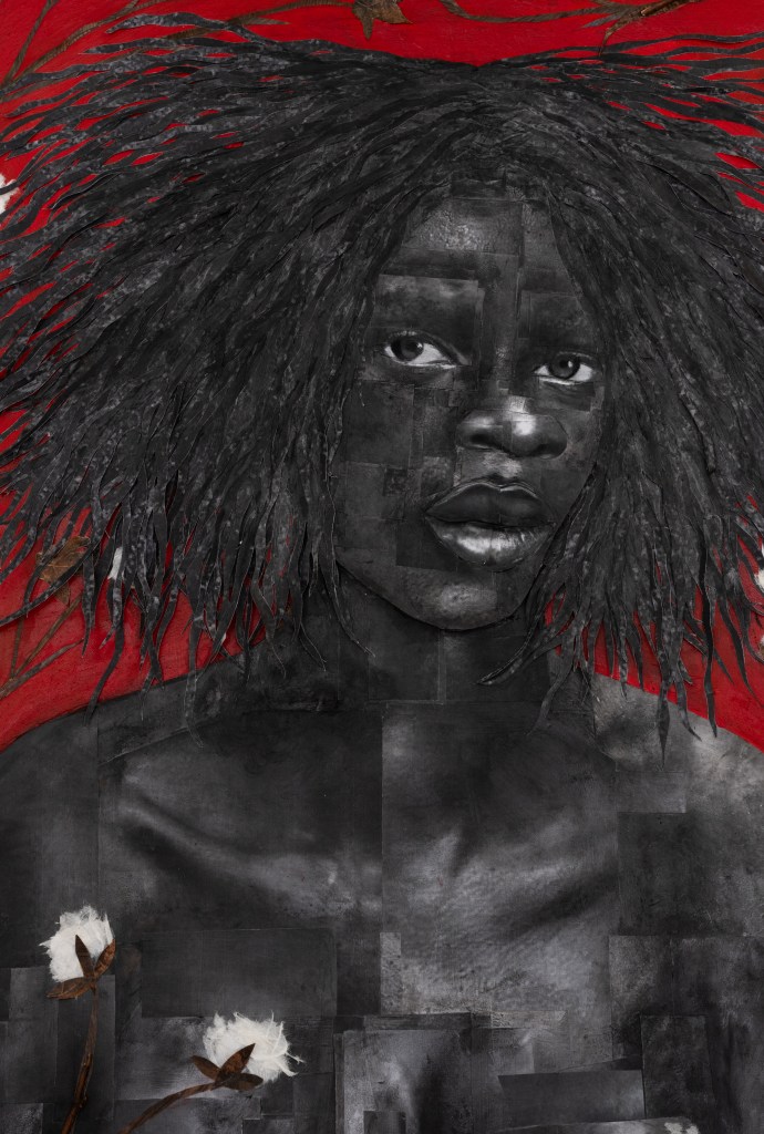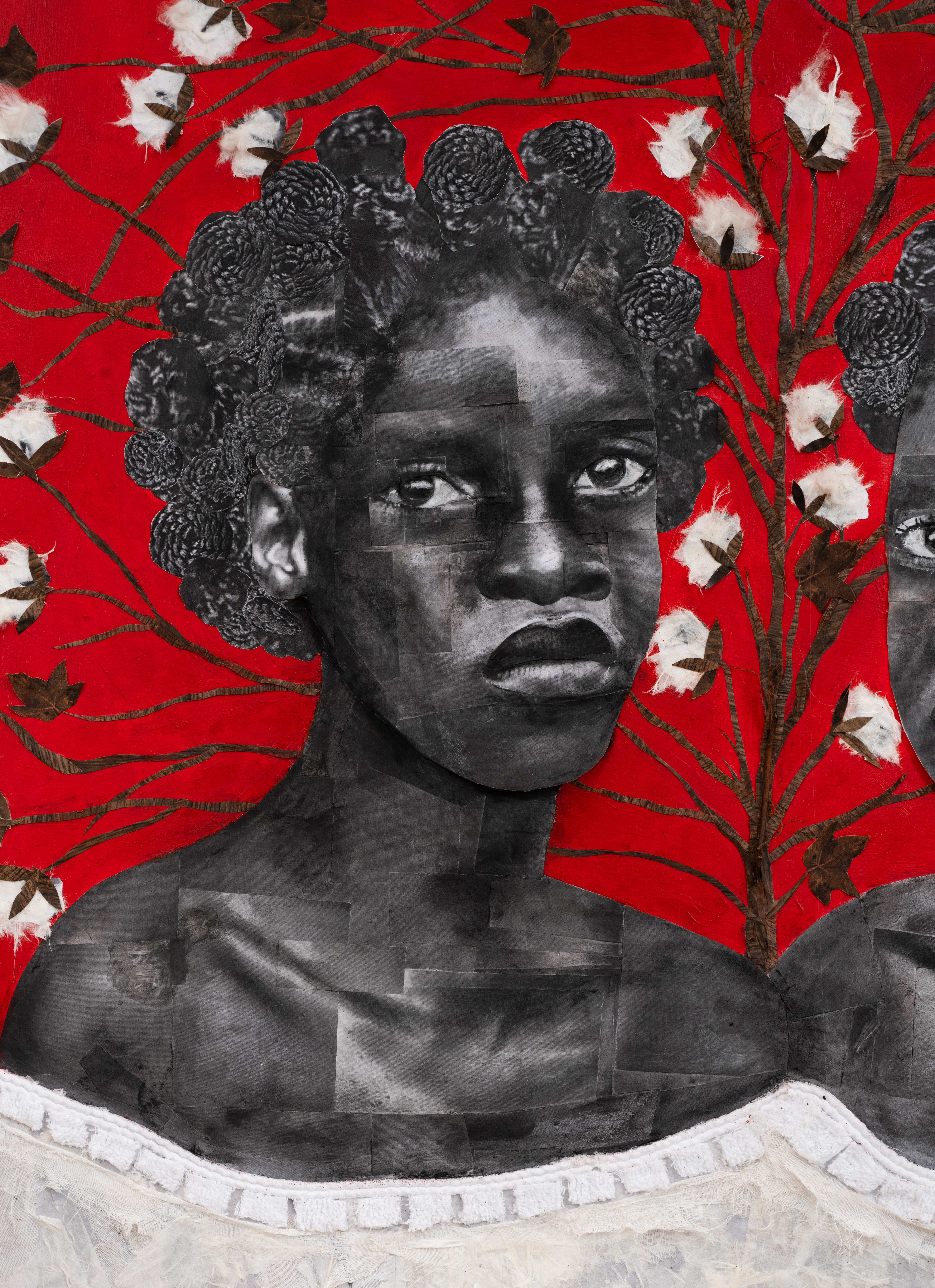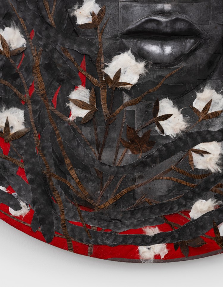 The Cotton Flower series uses portraiture to center Black women in historical discourse surrounding enslaved resistance. In slave societies, power was constructed through the use of race and gender. Enslaved women were exploited not only for their labor but also for their capacity to sustain the workforce through childbirth. The persistent threat of sexualized violence and forced familial separation pushed some women to subvert reproduction by engaging in bold acts of resistance. On cotton plantations, in particular, some enslaved women chose to ingest cotton roots to prevent pregnancy and induce abortions. By asserting their bodily autonomy, these Black women insurgents directly challenged the slave economy. In an effort to reconcile with and transform the profound pain of the history of enslavement into power, the Cotton Flower series re-envisions cotton plants as symbols of gendered resistance – instruments powerfully wielded by enslaved Black women to circumvent systems of oppression and fight for selfhood.